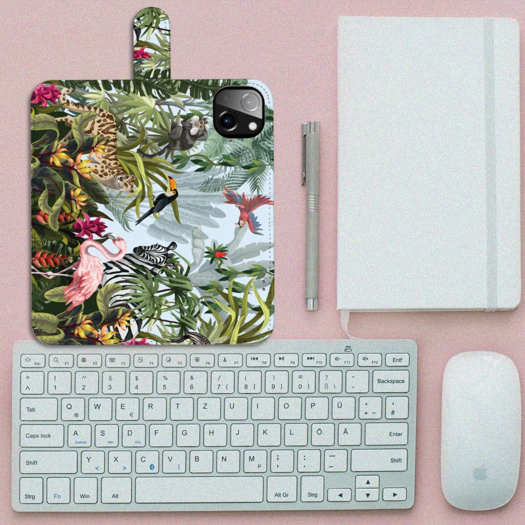 Ben je op zoek naar een tropische verrassing voor je iPhone 14 Plus? Dan is dit hoesje in jungle stijl zeker iets voor jou! Met de verschillende soorten dieren waan je je even in de jungle, vind je ook niet? Dit design wordt geprint op een Telefoonhoesje met Pasjes waarin je drie pasjes kwijt kunt. Het hoesje wordt afgesloten met een sluit lipje, waardoor jouw telefoon altijd goed beschermd is. Bescherm je iPhone 14 Plus vandaag nog met dit stoere jungle design hoesje!