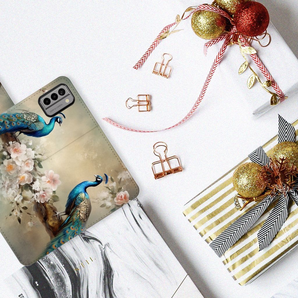 Wist je dat de sleep van pauwen bestaat uit wel 150 kleurige veren? Als de haan zijn sleep opzet om een vrouwtje te veroveren dan zie je deze veren het duidelijkst. Er zijn mensen die geloven dat een pauwenveer geluk brengt! Daarom mag dit romantische vintage pauwen design zeker niet ontbreken in onze collectie. Het blijven toch echt prachtige en fascinerende dieren om te zien! Dit design wordt geprint op een Telefoonhoesje met Pasjes speciaal op maat gemaakt voor de Nokia G22. In dit hoesje kun je drie pasjes kwijt, super handig toch? Het hoesje wordt afgesloten met een sluit lipje, waardoor jouw telefoon altijd goed beschermd is. Bescherm je Nokia G22 vandaag nog dit romantische vintage pauwen design hoesje!