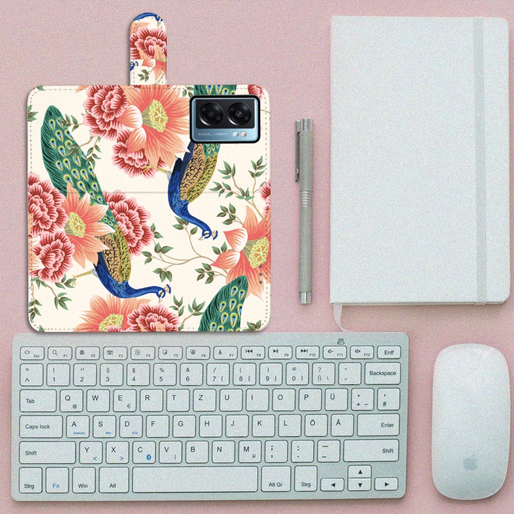 OPPO A77 5G | A57 5G Telefoonhoesje met Pasjes Pauw met Bloemen