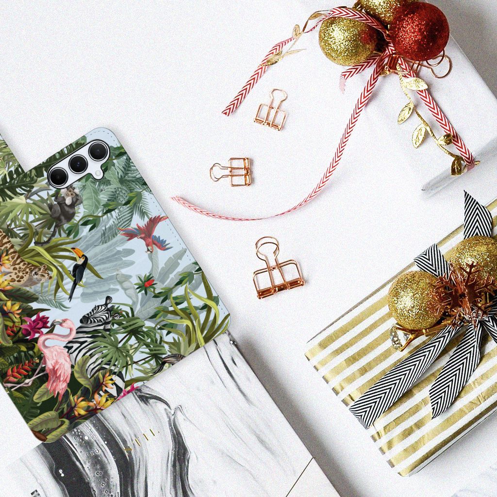 Ben je op zoek naar een tropische verrassing voor je Samsung Galaxy A55? Dan is dit hoesje in jungle stijl zeker iets voor jou! Met de verschillende soorten dieren waan je je even in de jungle, vind je ook niet? Dit design wordt geprint op een Telefoonhoesje met Pasjes waarin je drie pasjes kwijt kunt. Het hoesje wordt afgesloten met een sluit lipje, waardoor jouw telefoon altijd goed beschermd is. Bescherm je Samsung Galaxy A55 vandaag nog met dit stoere jungle design hoesje!