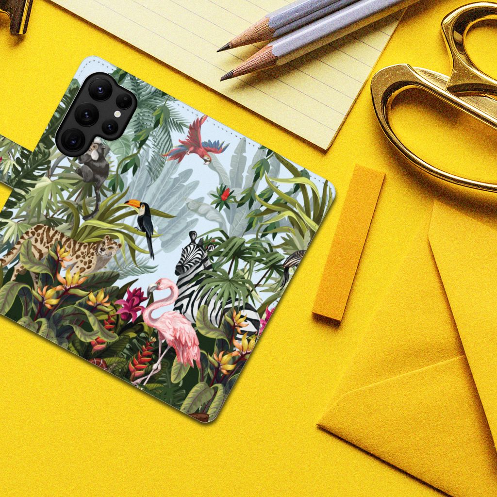 Ben je op zoek naar een tropische verrassing voor je Samsung Galaxy S23 Ultra? Dan is dit hoesje in jungle stijl zeker iets voor jou! Met de verschillende soorten dieren waan je je even in de jungle, vind je ook niet? Dit design wordt geprint op een Telefoonhoesje met Pasjes waarin je drie pasjes kwijt kunt. Het hoesje wordt afgesloten met een sluit lipje, waardoor jouw telefoon altijd goed beschermd is. Bescherm je Samsung Galaxy S23 Ultra vandaag nog met dit stoere jungle design hoesje!