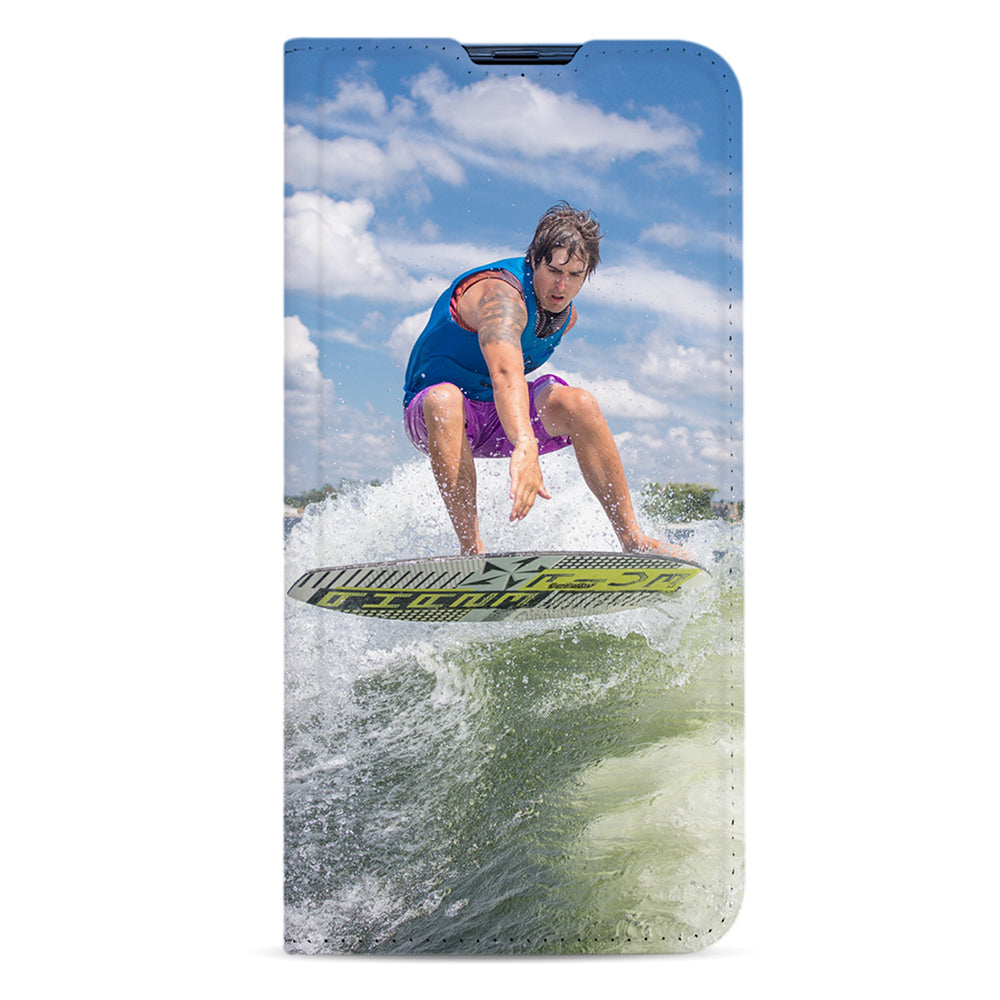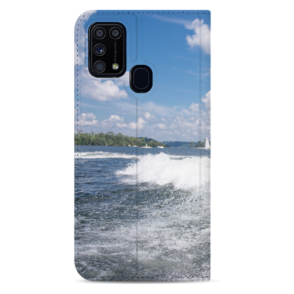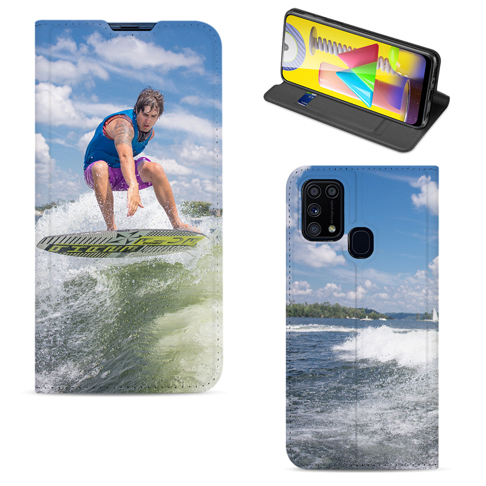 Telefoonhoesje Ontwerpen Galaxy M31 met Foto. Ben je op zoek naar een originele en unieke bescherming voor je telefoon? Dan ben je bij B2C Telecom aan het juiste adres! Je kunt via onze website gemakkelijk een telefoonhoesje ontwerpen met foto's, tekst of bedrijfslogo. De mogelijkheden zijn eindeloos. Wees creatief en upload foto's of plaatjes van je kinderen, huisdieren, familie, hobby of favoriete voetbalclub. De foto's of plaatjes kun je in de gewenste grootte plaatsen of draaien voor een speels effect. Maak het hoesje persoonlijker door je naam of quote toe te voegen. Je kunt kiezen uit verschillende lettertypes; van strak tot vetgedrukt of ga je liever voor iets sierlijks? Het kan allemaal! De kers op de taart is natuurlijk de toevoeging van een glossy-effect! Kies uit verschillende effecten en jouw hoesje wordt subtiel bedrukt met een glossy-effect. Kortom, wij bieden verschillende mogelijkheden om jouw hoesje zo persoonlijk en uniek mogelijk te maken! Jouw ontwerp wordt bedrukt op een wit hoesje gemaakt van kunstleer. De binnenkant van het hoesje is donkergrijs en heeft één vakje voor een pasje. De houder waar je je telefoon in vast zet, is gemaakt van transparante TPU. Door de magneten aan de binnenkant, blijft het hoesje stevig dicht. Een ander voordeel is dat het hoesje een stand-case functie heeft voor als je graag filmpjes kijkt op je telefoon. Overtuigd? Ontwerp dan vandaag nog je eigen telefoonhoesje en ontvang jouw ontwerp binnen een aantal werkdagen in huis!