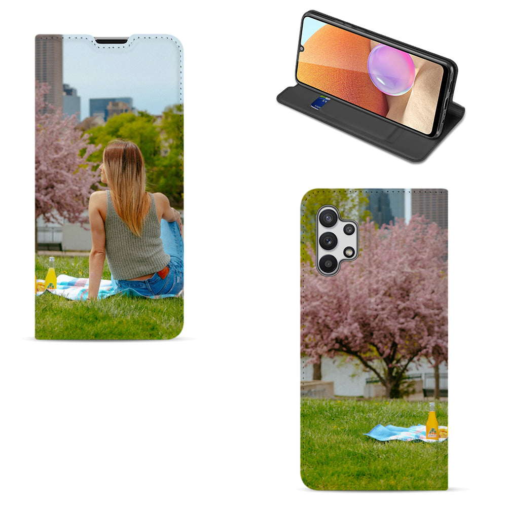 Telefoonhoesje Ontwerpen Samsung Galaxy A32 4G. Ben je op zoek naar een originele en unieke bescherming voor je telefoon? Dan ben je bij B2C Telecom aan het juiste adres! Je kunt via onze website gemakkelijk een telefoonhoesje ontwerpen met foto's, tekst of bedrijfslogo. De mogelijkheden zijn eindeloos. Wees creatief en upload foto's of plaatjes van je kinderen, huisdieren, familie, hobby of favoriete voetbalclub. De foto's of plaatjes kun je in de gewenste grootte plaatsen of draaien voor een speels effect. Maak het hoesje persoonlijker door je naam of quote toe te voegen. Je kunt kiezen uit verschillende lettertypes; van strak tot vetgedrukt of ga je liever voor iets sierlijks? Het kan allemaal! De kers op de taart is natuurlijk de toevoeging van een glossy-effect! Kies uit verschillende effecten en jouw hoesje wordt subtiel bedrukt met een glossy-effect. Kortom, wij bieden verschillende mogelijkheden om jouw hoesje zo persoonlijk en uniek mogelijk te maken! Jouw ontwerp wordt bedrukt op een wit hoesje gemaakt van kunstleer. De binnenkant van het hoesje is donkergrijs en heeft één vakje voor een pasje. De houder waar je je telefoon in vast zet, is gemaakt van transparante TPU. Door de magneten aan de binnenkant, blijft het hoesje stevig dicht. Een ander voordeel is dat het hoesje een stand-case functie heeft voor als je graag filmpjes kijkt op je telefoon. Overtuigd? Ontwerp dan vandaag nog je eigen telefoonhoesje en ontvang jouw ontwerp binnen een aantal werkdagen in huis!