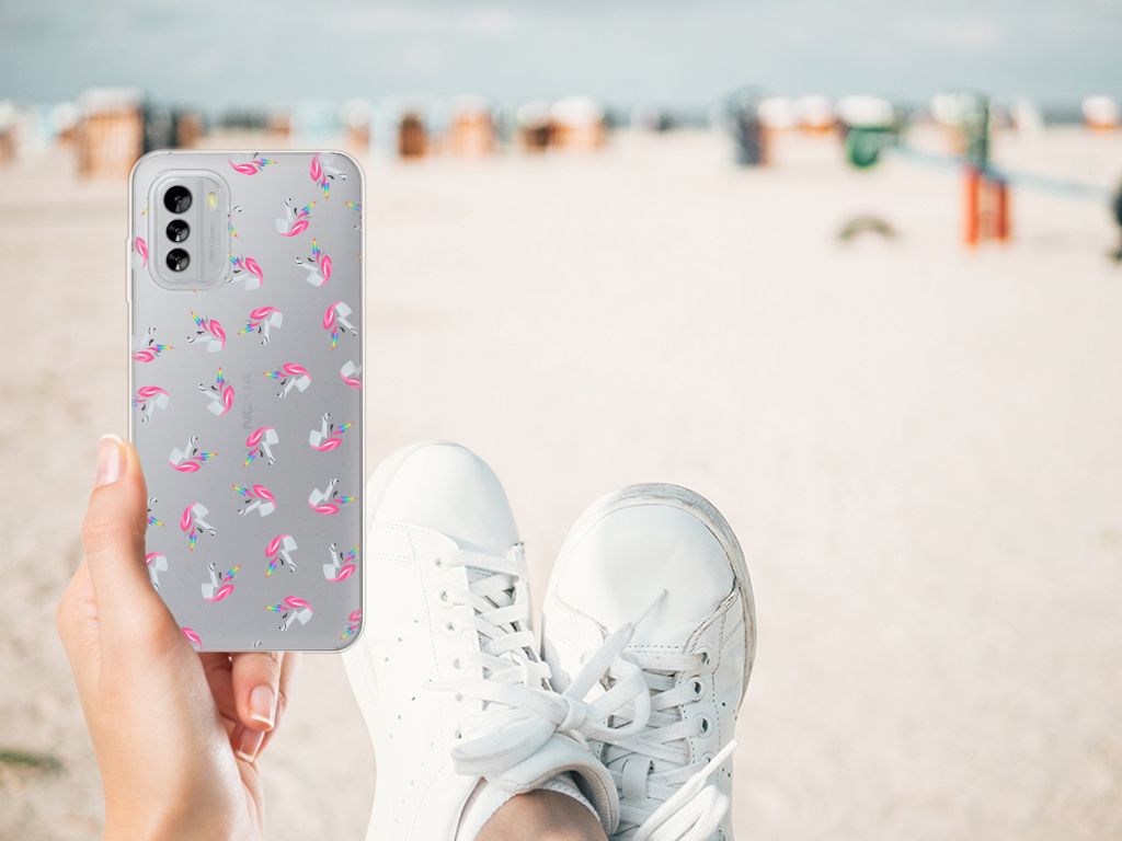 Vind jij unicorns ook zo leuk? Dan hebben wij het perfecte hoesje voor jouw Nokia G60! Met deze schattige unicorns heb jij gegarandeerd iets unieks in handen. Dit TPU bumper ligt prettig in de hand en is licht van gewicht. Alleen de achterkant van je telefoon wordt beschermd. Daarom adviseren wij om dit hoesje in combinatie met een screenprotector te gebruiken. Het unicorn design wordt alleen geprint en de achtergrond blijft transparant. Hierdoor zie je altijd de kleur van je smartphone. Hoe leuk is dat? Bescherm jouw telefoon vandaag nog met dit unicorn hoesje!