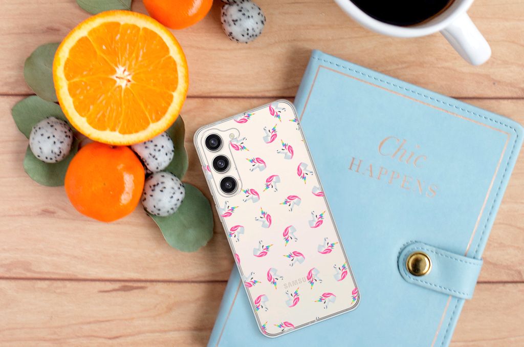 Vind jij unicorns ook zo leuk? Dan hebben wij het perfecte hoesje voor jouw Samsung Galaxy S23 Plus! Met deze schattige unicorns heb jij gegarandeerd iets unieks in handen. Dit TPU bumper ligt prettig in de hand en is licht van gewicht. Alleen de achterkant van je telefoon wordt beschermd. Daarom adviseren wij om dit hoesje in combinatie met een screenprotector te gebruiken. Het unicorn design wordt alleen geprint en de achtergrond blijft transparant. Hierdoor zie je altijd de kleur van je smartphone. Hoe leuk is dat? Bescherm jouw telefoon vandaag nog met dit unicorn hoesje!