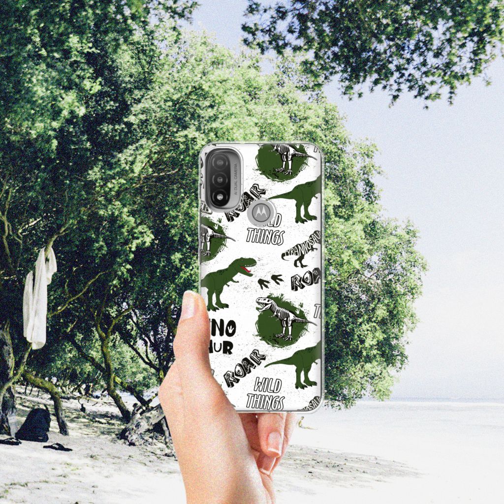 Ook een grote fan van alles wat met dinosaurussen te maken heeft? Dan mag dit hoesje met dino’s zeker niet ontbreken in jouw collectie! De skeletten, pootafdrukken en dino’s zorgen er hopelijk voor dat iedereen van jouw Motorola Moto E20 | E40 afblijft! Dit toffe dino design wordt geprint op een TPU Hoesje. Het ligt prettig in de hand en is licht van gewicht. Alleen de achterkant van je telefoon wordt beschermd. Daarom adviseren wij om dit hoesje in combinatie met een screenprotector te gebruiken. Bestel vandaag nog dit gevaarlijke Dinosaurus design hoesje!