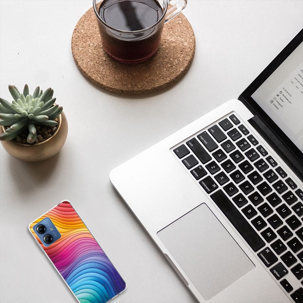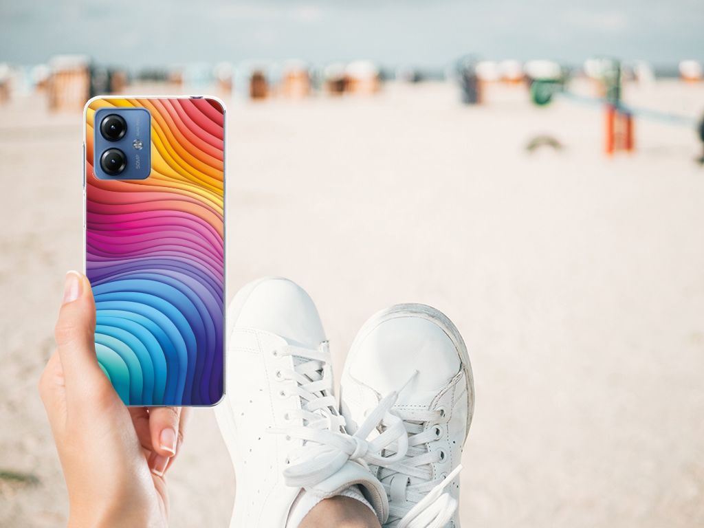 Een regenboog bestaat eigenlijk uit meer dan zeven kleuren, wist je dat? De zichtbare kleuren vloeien geleidelijk in elkaar over, waardoor er eigenlijk meer dan zeven kleuren zijn. Dat wij maar zeven ‘’stroken’’ licht zien, is dus eigenlijk gezichtsbedrog. Toch noemen wij dit hoesje regenboog, omdat wij er blij van worden! Dit design wordt geprint op een TPU Hoesje speciaal op maat gemaakt voor de Motorola Moto G14. Het ligt prettig in de hand en is licht van gewicht. Alleen de achterkant van je telefoon wordt beschermd. Daarom adviseren wij om dit hoesje in combinatie met een screenprotector te gebruiken. Bescherm jouw smartphone vandaag nog met dit super toffe regenboog hoesje!