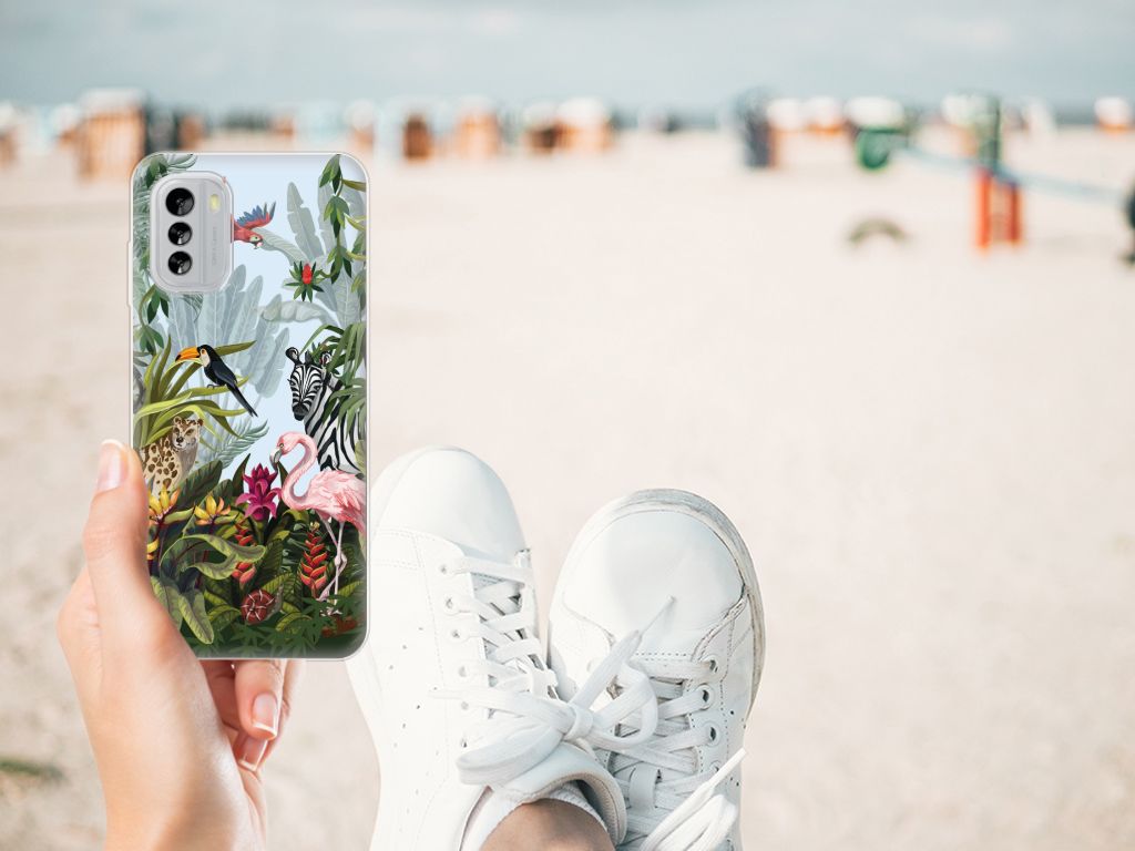 Ben je op zoek naar een tropische verrassing voor je Nokia G60? Dan is dit hoesje in jungle stijl zeker iets voor jou! Met de verschillende soorten dieren waan je je even in de Jungle, vind je ook niet? Dit design wordt geprint op een TPU Hoesje. Het ligt prettig in de hand en is licht van gewicht. Alleen de achterkant van je telefoon wordt beschermd. Daarom adviseren wij om dit hoesje in combinatie met een screenprotector te gebruiken. Bescherm jouw smartphone vandaag nog met dit stoere jungle design hoesje!