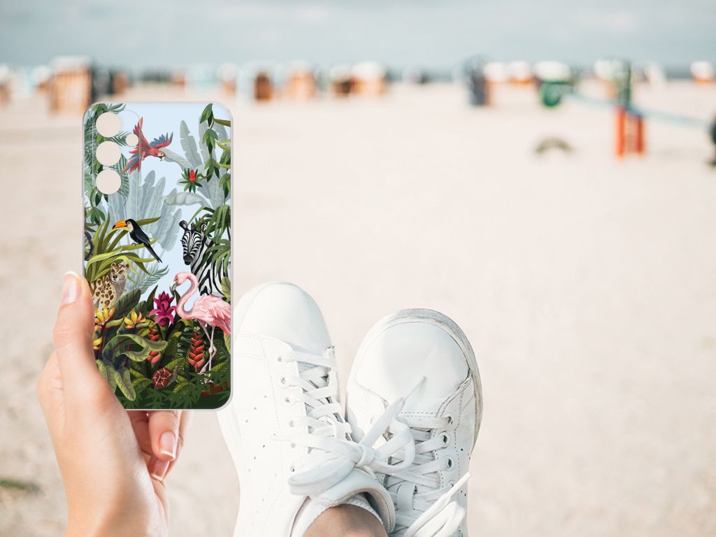 Ben je op zoek naar een tropische verrassing voor je Samsung Galaxy A15? Dan is dit hoesje in jungle stijl zeker iets voor jou! Met de verschillende soorten dieren waan je je even in de Jungle, vind je ook niet? Dit design wordt geprint op een TPU Hoesje. Het ligt prettig in de hand en is licht van gewicht. Alleen de achterkant van je telefoon wordt beschermd. Daarom adviseren wij om dit hoesje in combinatie met een screenprotector te gebruiken. Bescherm jouw smartphone vandaag nog met dit stoere jungle design hoesje!
