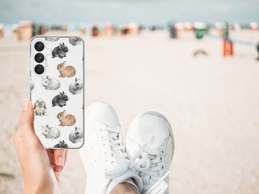 Wist je dat er wel 50 verschillende konijnenrassen zijn die zich onderscheiden in kleur, vacht, bouw en formaat? Daarom kon dit design met konijntjes eigenlijk niet ontbreken in onze collectie hoesjes. Wij zijn in ieder geval helemaal verliefd op deze schattige konijntjes. Dit design wordt geprint op een TPU Hoesje speciaal op maat gemaakt voor de Samsung Galaxy A55. Het ligt prettig in de hand en is licht van gewicht. Alleen de achterkant van je telefoon wordt beschermd. Daarom adviseren wij om dit hoesje in combinatie met een screenprotector te gebruiken. Bescherm jouw smartphone vandaag nog met dit super schattige hoesje met konijntjes!