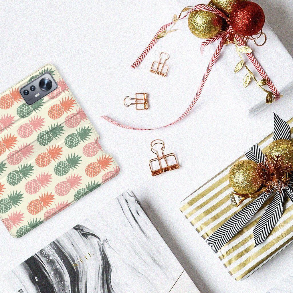 Ananas is een woord uit het Tupi, de taal van de Tupi-indianen, en betekent uitmuntende vrucht. Dit fruit van zeer hoge kwaliteit staat op onze superieure boekhoesjes, stand cases, hard cases en TPU cases. Jij blijft er gezond uitzien als je zo nu en dan een hap neemt van een Ananas , jouw smartphone blijft tip top in orde als je er een leuk telefoonhoesje omheen doet. Een ananas heeft stevig, veerkrachtig vruchtvlees. Een beetje te vergelijken met het TPU in onze hoesjes. TPU is elastisch materiaal, dat zeer buigzaam is. Vandaar dat het zeer schokbestendig is. Het ananas design staat op een stand case. Deze Xiaomi 12 | 12X Flip Style Cover beschermt jouw telefoon aan alle kanten en beschikt over een 1 opbergvakje en een speciale standaard. Het hoesje wordt afgesloten met een magneet aan de binnenzijde. De houder aan de binnenzijde is van TPU.