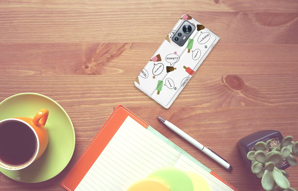 Van deze vrolijke Xiaomi 12 | 12X Flip Style Cover met daarop verschillende soorten ijsjes met tekstwolkjes krijg je sowieso een vrij en zomers gevoel. De zomer komt naar je toe met deze print van ijsjes met tekstwolkjes. Ben je op het strand, dan ontbreekt een lekker ijsje natuurlijk niet. Net zoals je je smartphone bij de hand hebt, met daaromheen een design hoesje met bijzondere ijsjes en tekstwolkjes. Jouw telefoon kan dan de bescherming in de vorm van een stand case met ijsjes zeer goed gebruiken. Alle zijden van dit hoesje worden bedrukt met ijsjes en dankzij de speciale standaard is het erg prettig om filmpjes te bekijken. De case wordt aan de binnenzijde met een magneet afgesloten en de houder aan de binnenzijde is van TPU. Onder alle weersomstandigheden zal deze case met 1 opbergvakje en ijsjes perfect functioneren, ook op het strand met een ijsje in je hand.
