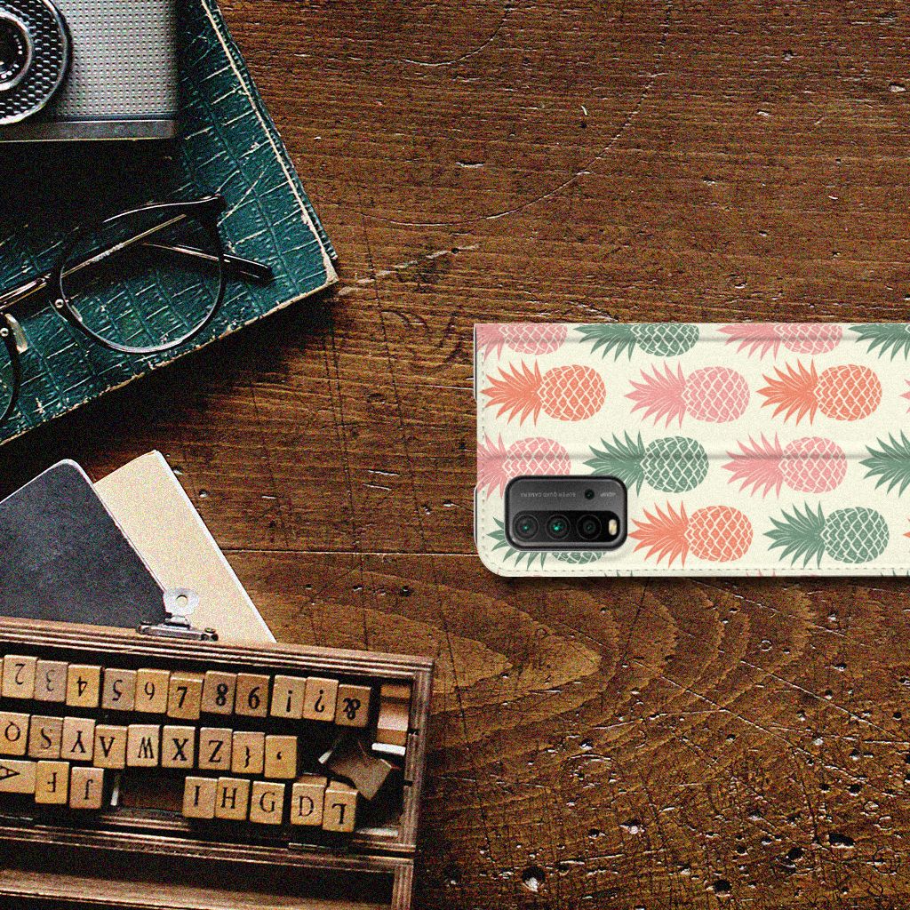 Ananas is een woord uit het Tupi, de taal van de Tupi-indianen, en betekent uitmuntende vrucht. Dit fruit van zeer hoge kwaliteit staat op onze superieure boekhoesjes, stand cases, hard cases en TPU cases. Jij blijft er gezond uitzien als je zo nu en dan een hap neemt van een Ananas , jouw smartphone blijft tip top in orde als je er een leuk telefoonhoesje omheen doet. Een ananas heeft stevig, veerkrachtig vruchtvlees. Een beetje te vergelijken met het TPU in onze hoesjes. TPU is elastisch materiaal, dat zeer buigzaam is. Vandaar dat het zeer schokbestendig is. Het ananas design staat op een stand case. Deze Xiaomi Poco M3 | Redmi 9T Flip Style Cover beschermt jouw telefoon aan alle kanten en beschikt over een 1 opbergvakje en een speciale standaard. Het hoesje wordt afgesloten met een magneet aan de binnenzijde. De houder aan de binnenzijde is van TPU.
