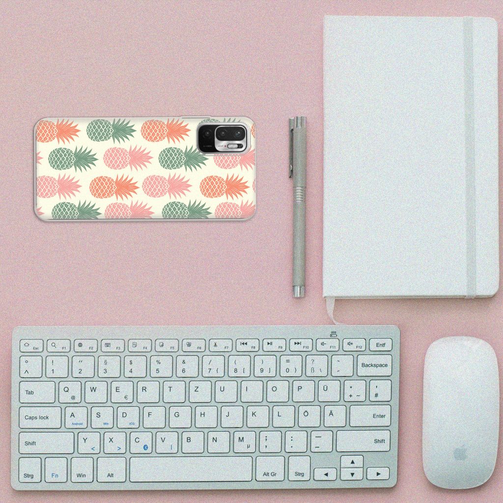 Ananas is een woord uit het Tupi, de taal van de Tupi-indianen, en betekent uitmuntende vrucht. Dit fruit van zeer hoge kwaliteit staat op onze superieure boekhoesjes, stand cases, hard cases en TPU cases. Jij blijft er gezond uitzien als je zo nu en dan een hap neemt van een Ananas , jouw smartphone blijft tip top in orde als je er een leuk telefoonhoesje omheen doet. Een ananas heeft stevig, veerkrachtig vruchtvlees. Een beetje te vergelijken met het TPU in onze hoesjes. TPU is elastisch materiaal, dat zeer buigzaam is. Vandaar dat het zeer schokbestendig is. Het ananas design staat op een staat op een TPU case. Deze Xiaomi Redmi Note 10/10T 5G | Poco M3 Pro Siliconen Case wordt alleen aan de bovenkant bedrukt en is zeer flexibel. De randen van het hoesje blijven transparant.