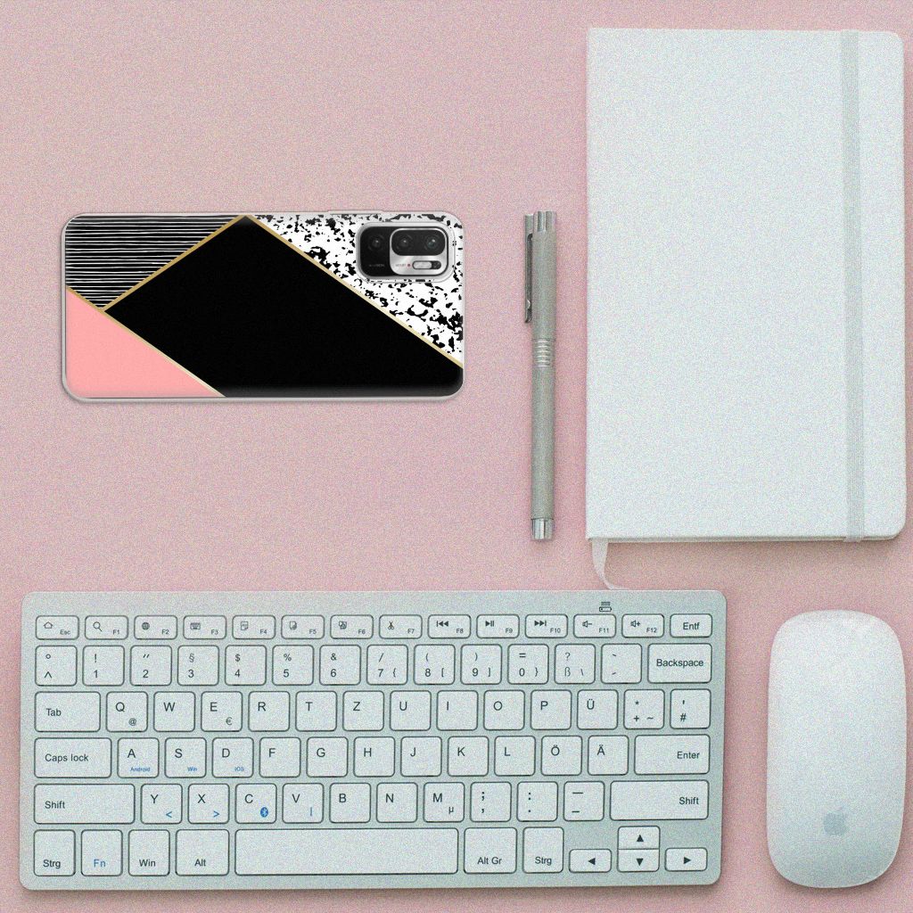 - Met een tpu-siliconen hoesje met roze, zwarte en witte vlakken blijft jouw telefoon in tact.