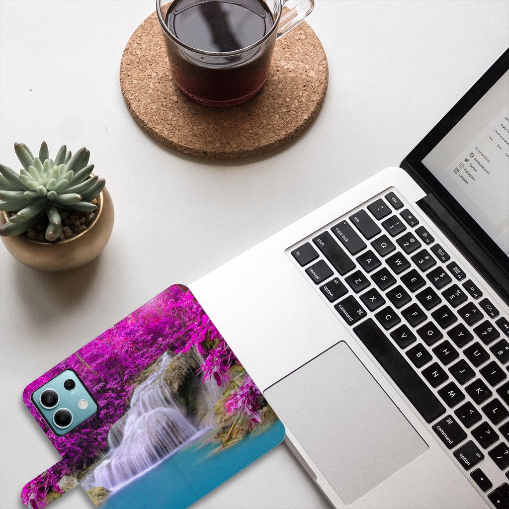 Op deze Xiaomi Redmi Note 13 5G Flip Cover zie je een kalme waterval en de achtergrond is gevuld met paarse bomen. Samen creëert dit een prachtig en kleurrijk spektakel, iets wat je graag op je Xiaomi Redmi Note 13 5G hoesje ziet. Wanneer je hiernaar kijkt, word je direct kalm. Als jij je even boos of verdrietig voelt, hoef je alleen maar naar jouw boekhoesje te kijken om weer blij te worden. Ook jouw telefoon zal blij zijn met deze Flip Cover aangezien deze goede bescherming biedt. Als jij je telefoon per ongeluk laat vallen, is er niets aan de hand. Het hoesje zorgt ervoor dat de telefoon intact blijft. Zelfs als hij op het beeldscherm zou vallen, is er dankzij de magnetische sluiting, niets aan de hand.