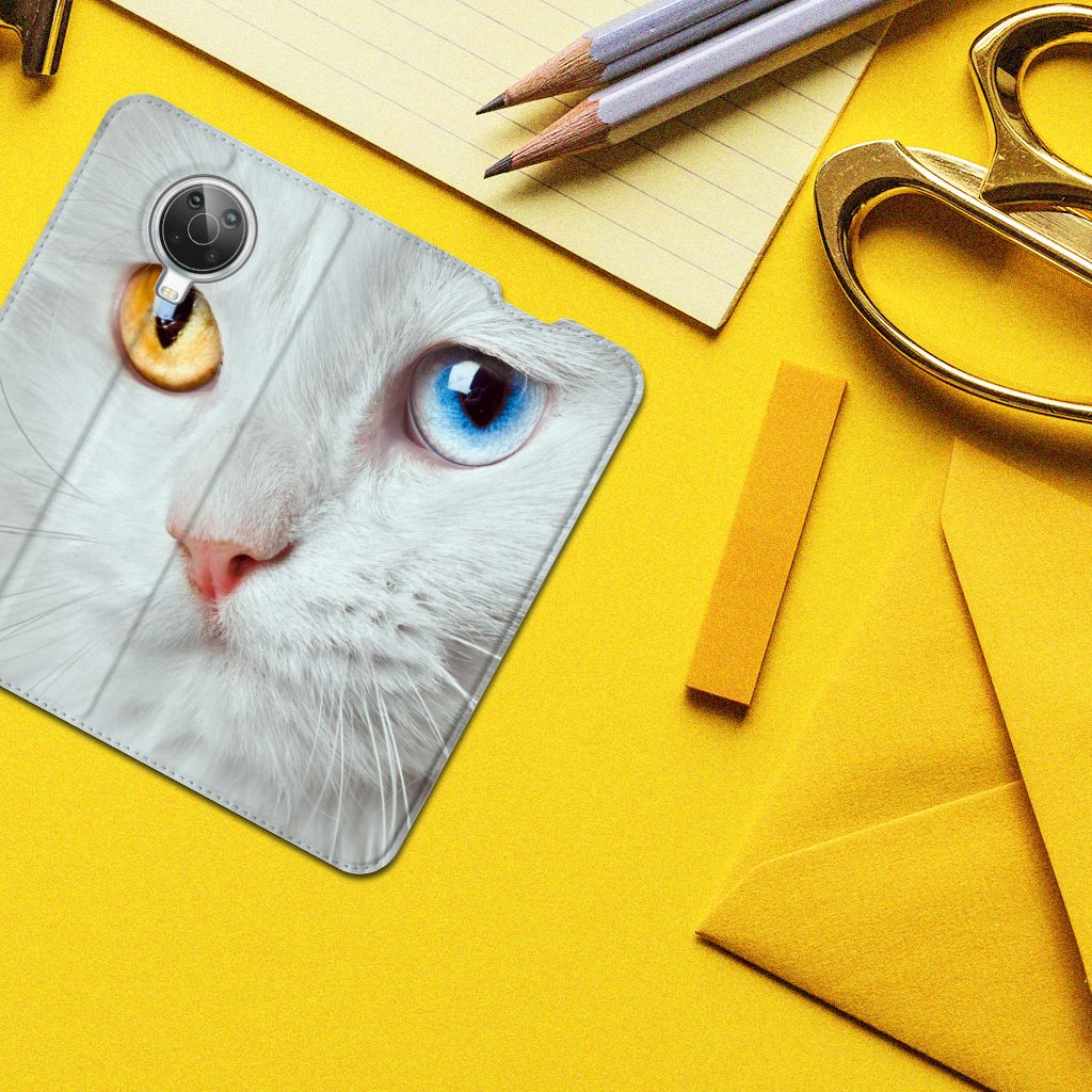 Witte katten zijn natuurlijk extra speciaal, vandaar we een exemplaar op een design hoesje hebben gezet. Een witte kat schijnt trouwens ook slechter te kunnen horen dan katten met een andere kleur. Deze witte kat staat op een zeer prominente wijze op een stand case. Deze stand case met witte kat ziet er geweldig uit en is voorzien van verschillende uitsparingen en een speciale standaard. Een Nokia G10 | G20 Hoesje maken met witte kat beschermt jouw smartphone perfect. Alle zijden van de case zijn bedrukt. Jouw smartphone wordt erg duurzaam met dit design hoesje. Het TPU aan de binnenzijde is zeer flexibel en het pu-leer oogt chique. Verder heeft de case een houder voor bijvoorbeeld je rijbewijs aan de binnenkant.